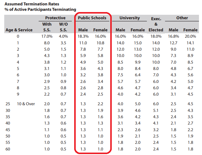 Again contrary to popular perception, public school employees in Wisconsin have comparable turnover rates as other public-sector workers, with the exception of a small group of protective service employees who do not receive Social Security. (In this context, "termination" means employees leaving the pension system. That is, teachers who transfer schools or districts are not counted in this statistic.)